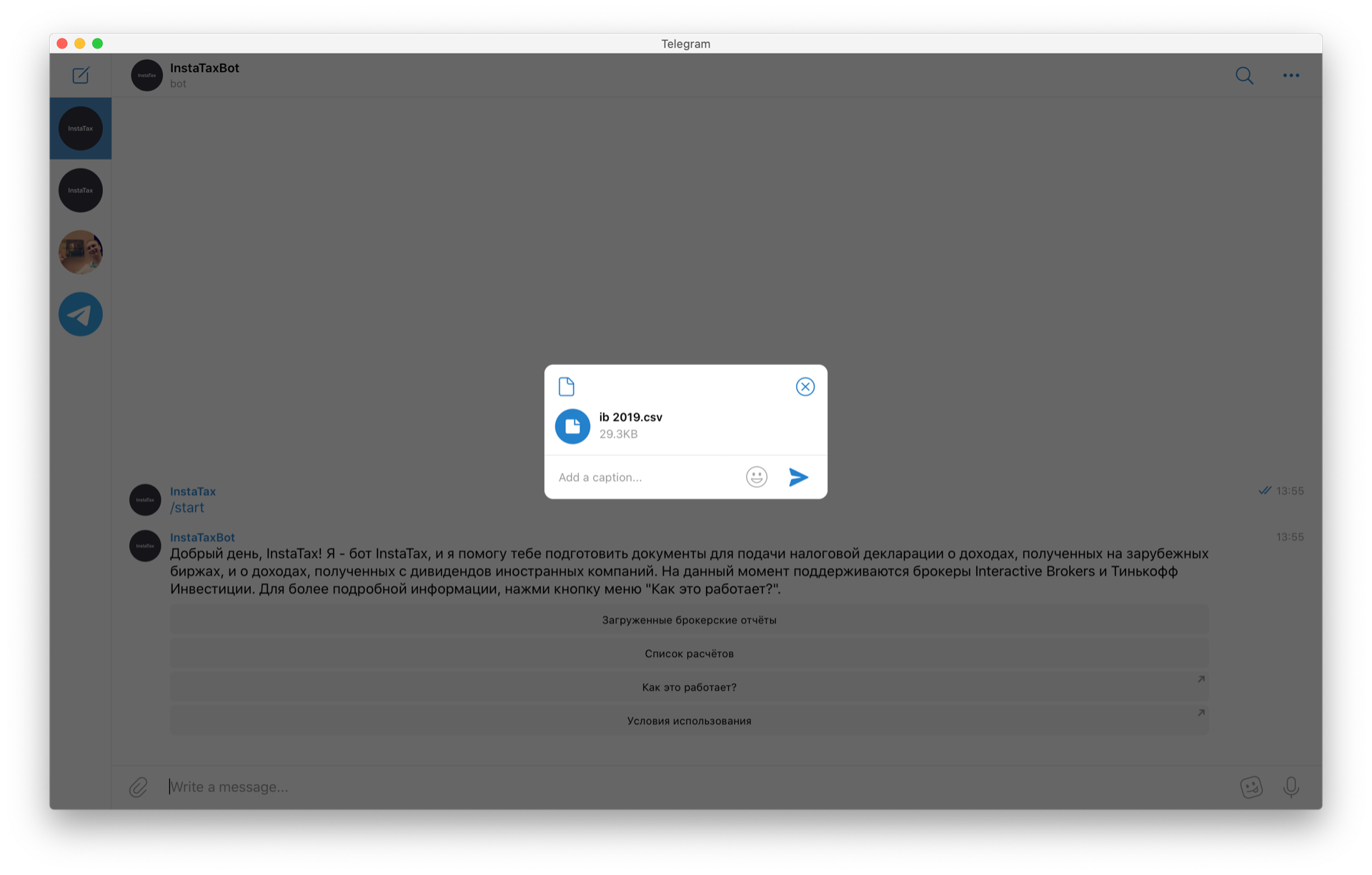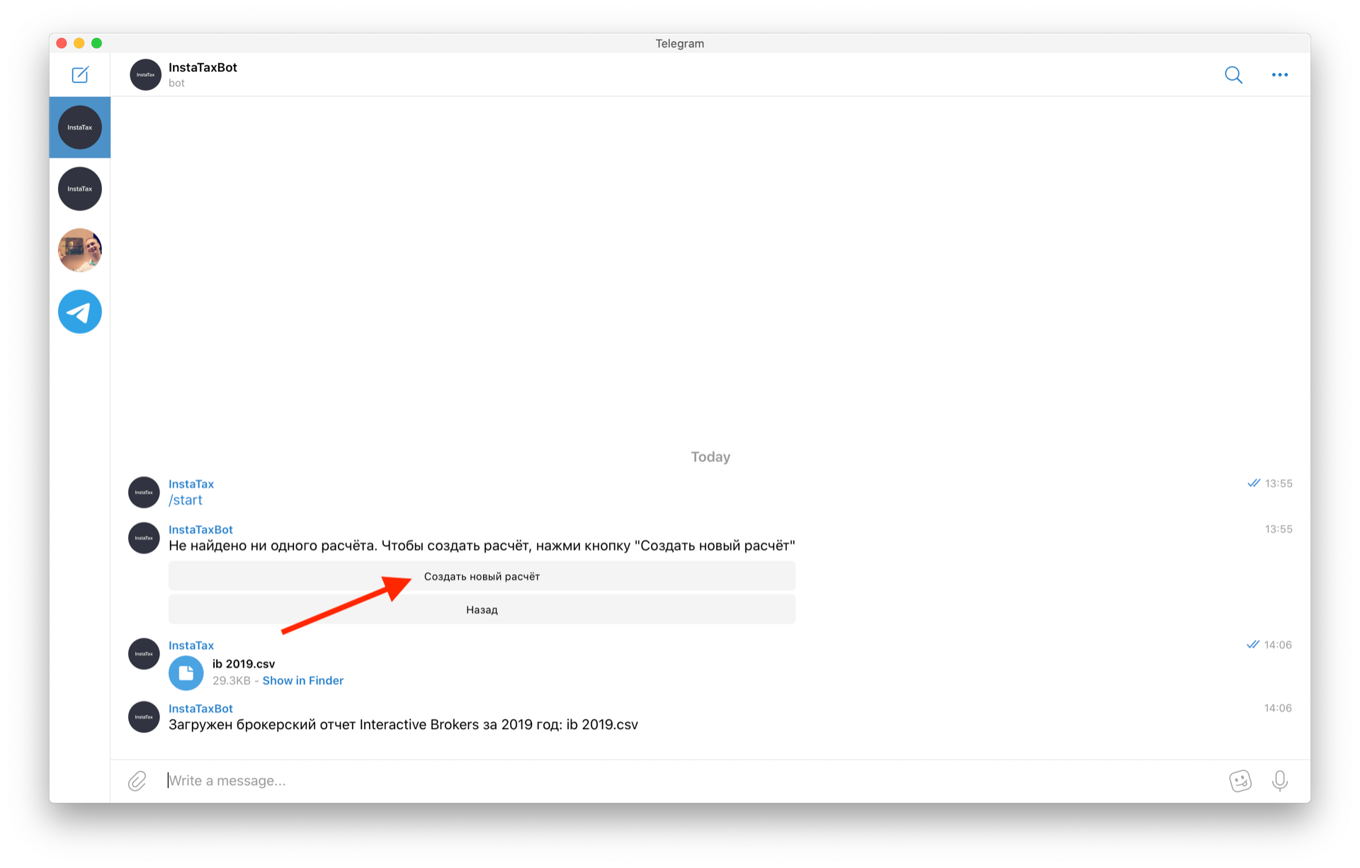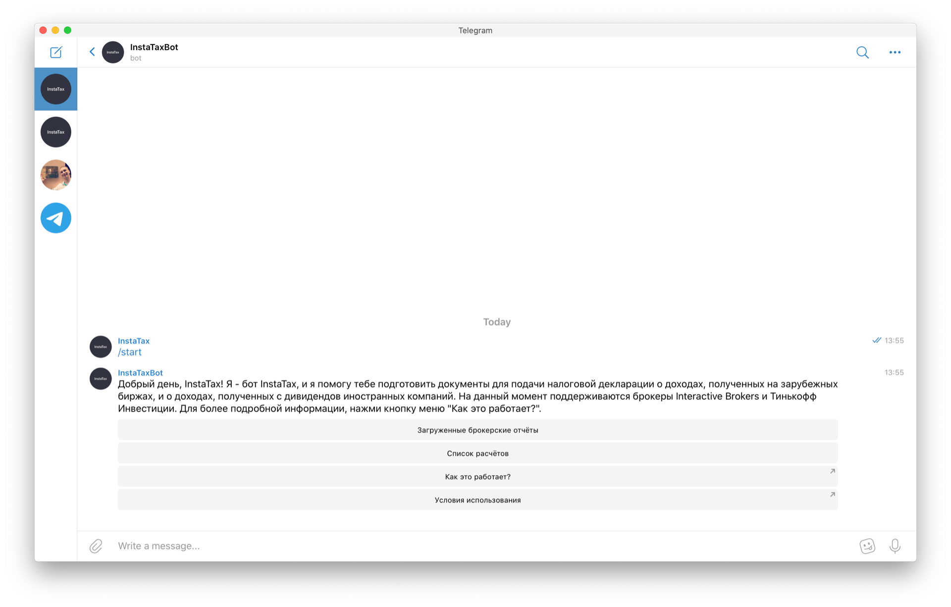 InstaTax - это telegram-бот. Поэтому для работы необходимо установить на компьютер или телефон программу Telegram.