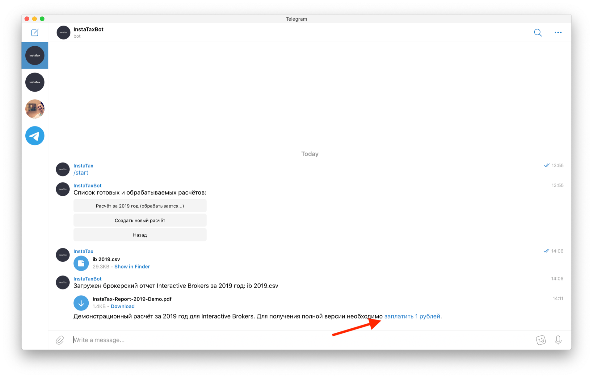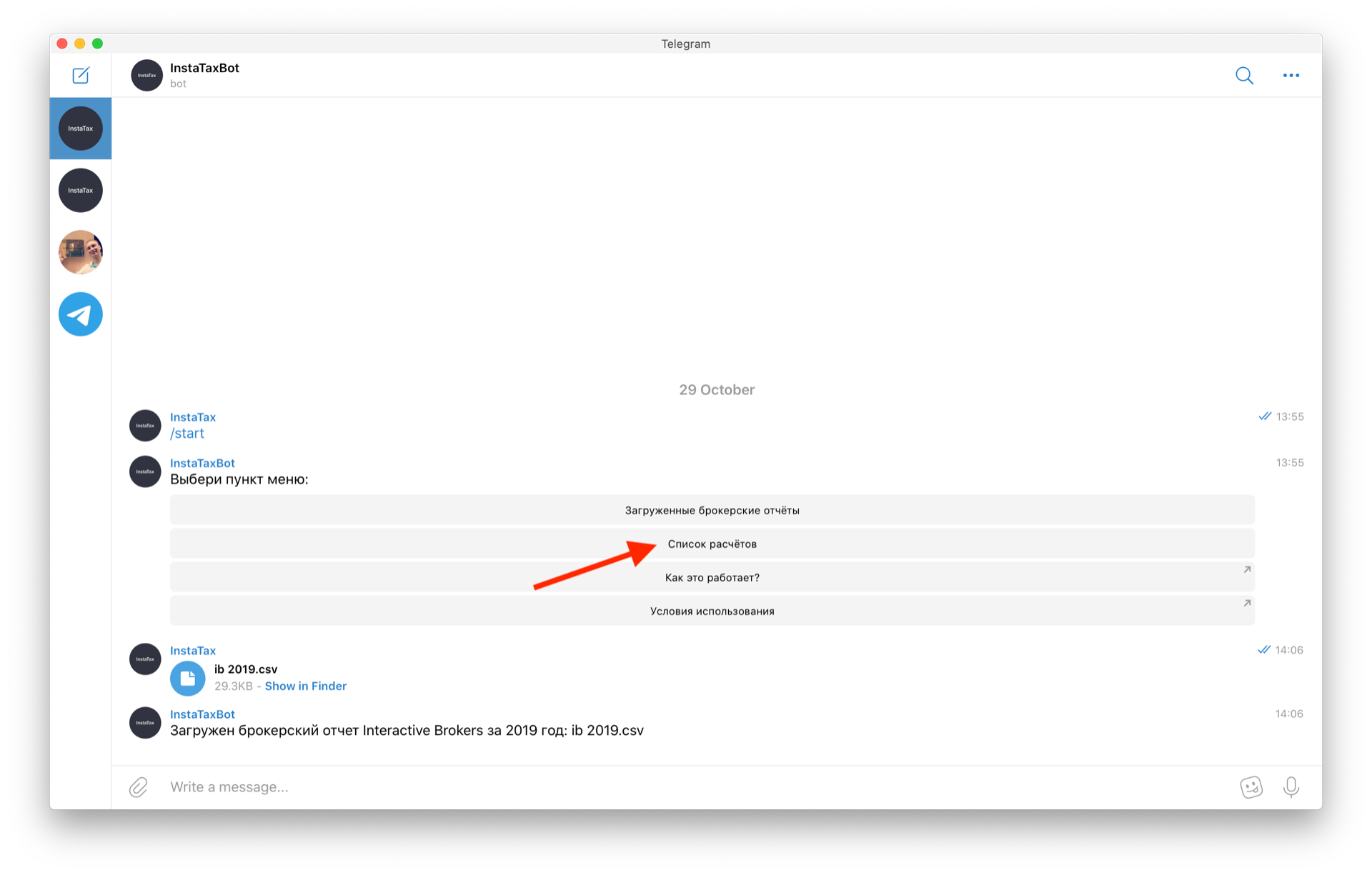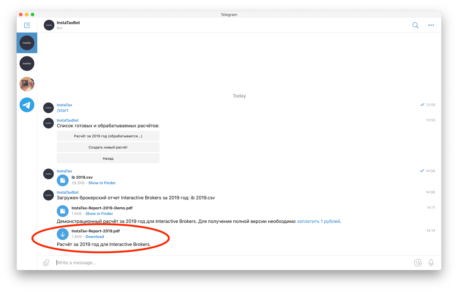 InstaTax - это telegram-бот. Поэтому для работы необходимо установить на компьютер или телефон программу Telegram.
