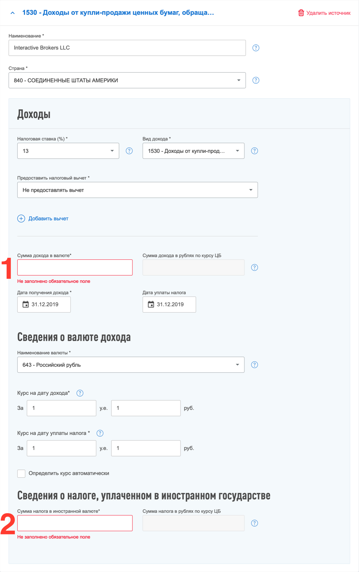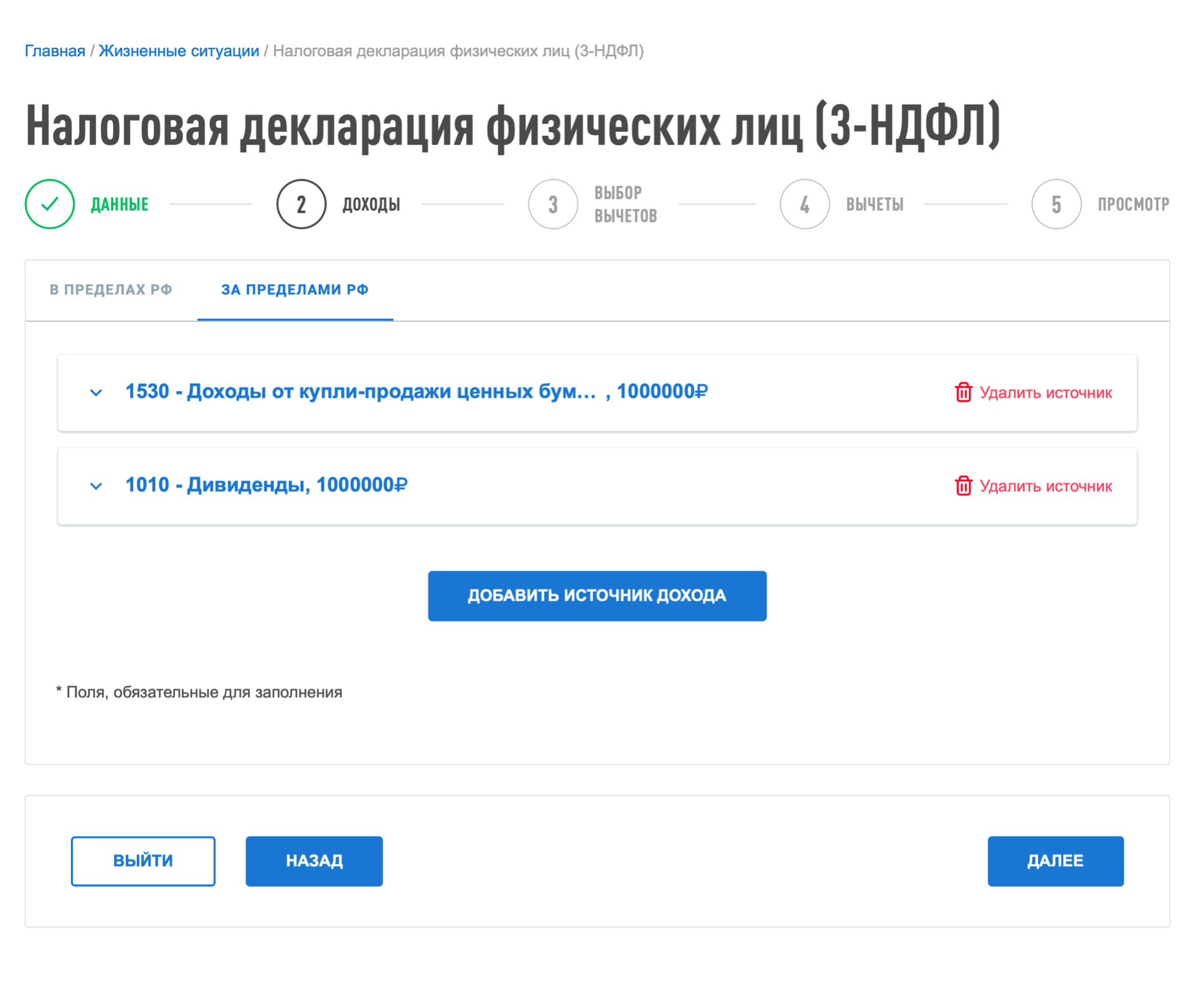 - Потом во вкладке "За пределами РФ" добавь источник доходов для каждого вида доходов для каждого брокера по отдельности