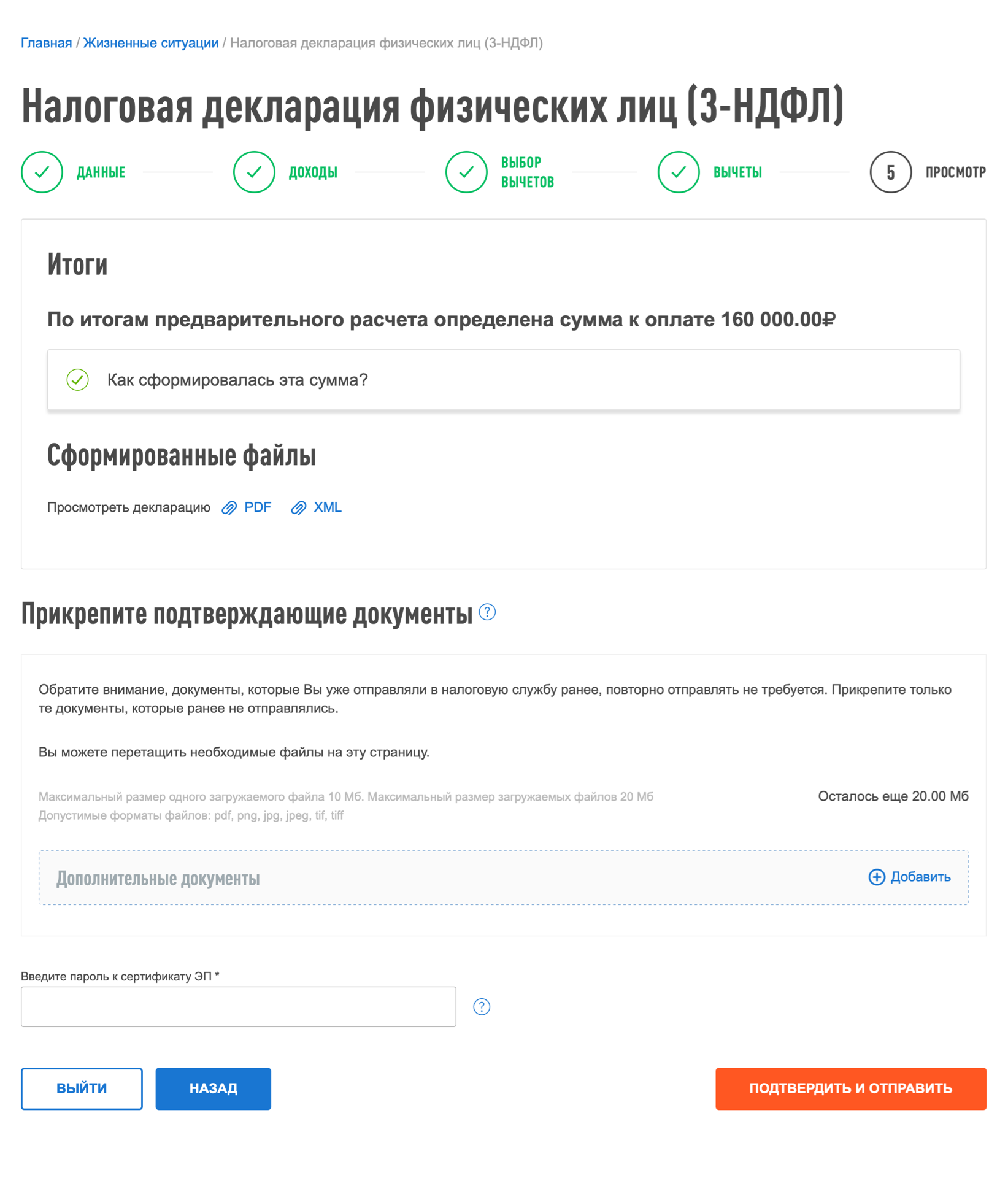 - После заполнения всех источников доходов нужно проверить сформированную декларацию, прикрепить подтверждающие документы и отправить декларацию на проверку в налоговую службу