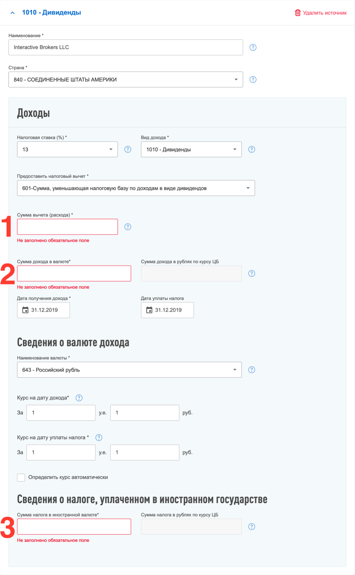 - Если в отчетном периоде были выплачены дивиденды, нужно заполнить добавленный источник дохода как указан на картинке ниже